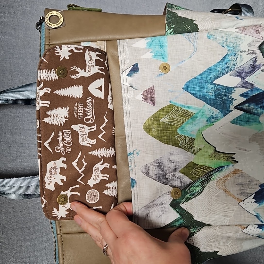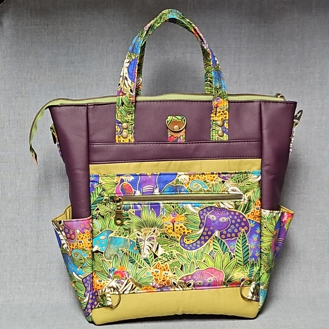 This bag is so Versatile!! It can be worn as a shoulder bag, a backpack or carried as a tote bag. Two side pockets hold a smaller water bottle. Ultimate organization with four outer pockets, two side pockets, four inside slip pockets and an inside zip pocket. Made with reinforced cotton fabric and faux leather. This is a "beefy" bag. Stands on it's own. Comes with two adjustable straps that are interchangeable so you can carry the bag how you want. This bag also has feet and a zip top closure.